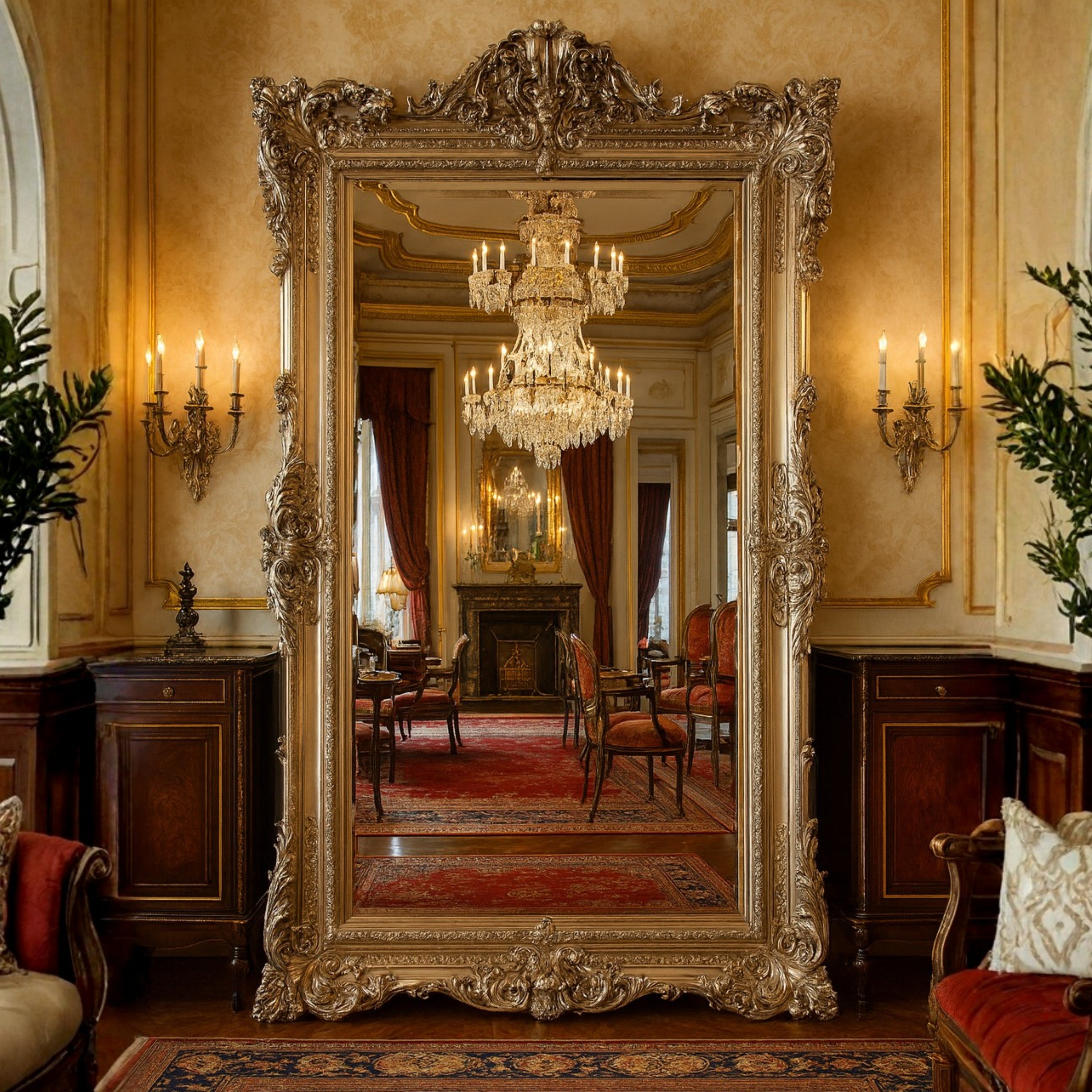 Make an uncompromising statement of elegance and grandeur with The Grand Venetian Looking Glass. This magnificent, full-length mirror frame is designed to command a space, serving as a powerful architectural accent in a luxury foyer, master dressing room, or formal living area.