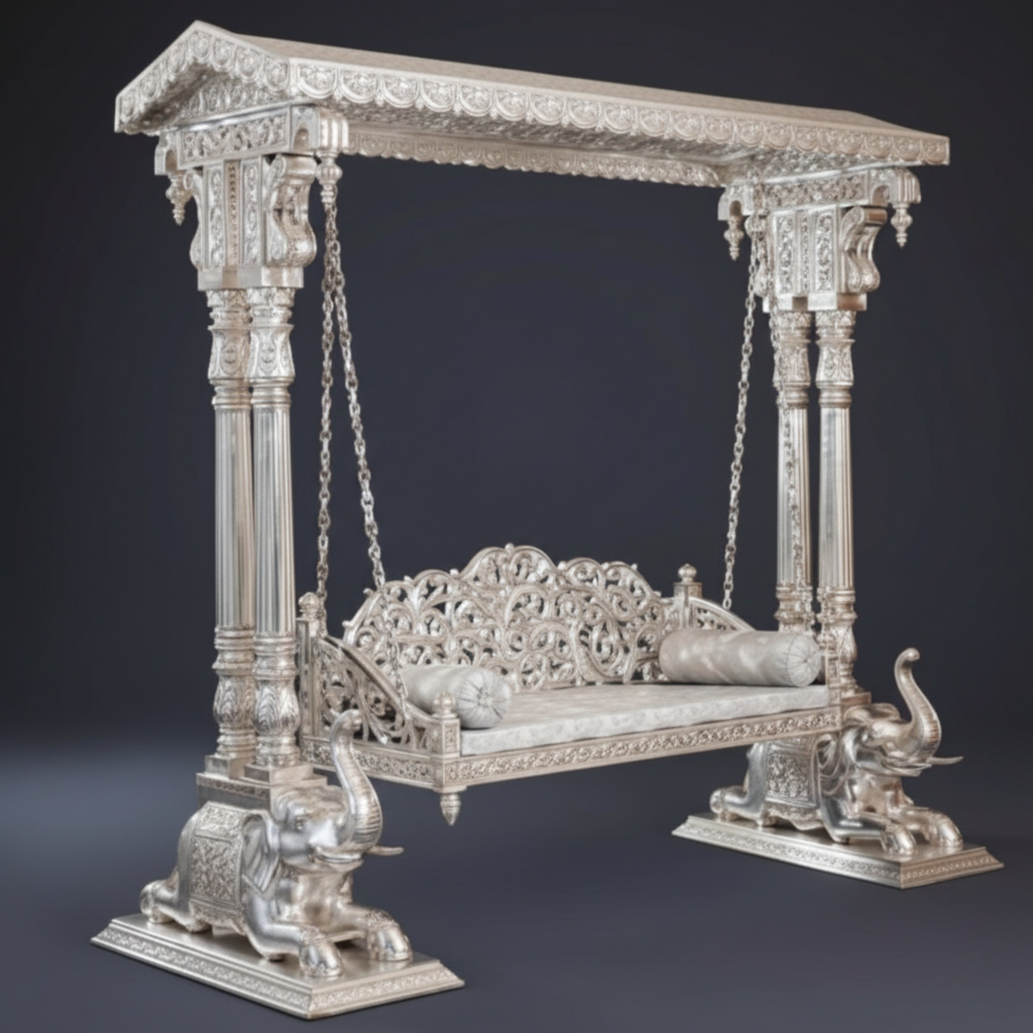 Define a space with the unparalleled grandeur of The Imperial Argent Jhula, an architectural furniture piece that transcends conventional seating. This magnificent, hand-carved indoor swing is the ultimate expression of bespoke luxury, designed to serve as a stunning, comfortable, and awe-inspiring focal point in a grand estate.