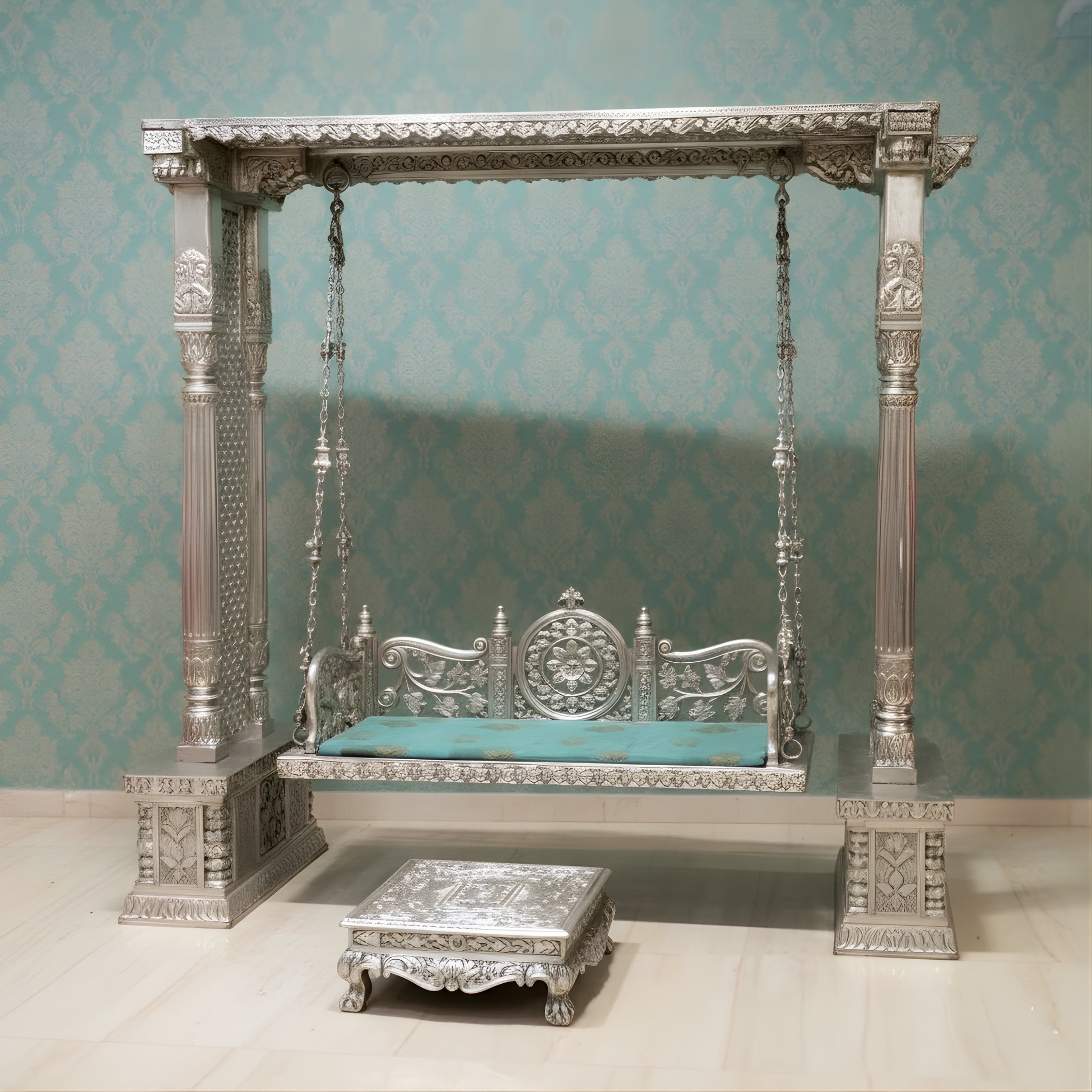 Claim the ultimate statement piece for your luxury estate withThe Imperial Argent Jhula Arch. This monumental, indoor swing is an architectural installation, meticulously crafted to serve as a breathtaking, functional focal point in a grand foyer, master living room, or conservatory. It is the epitome of the "Rajwadi" (Royal) tradition reimagined in precious metal.