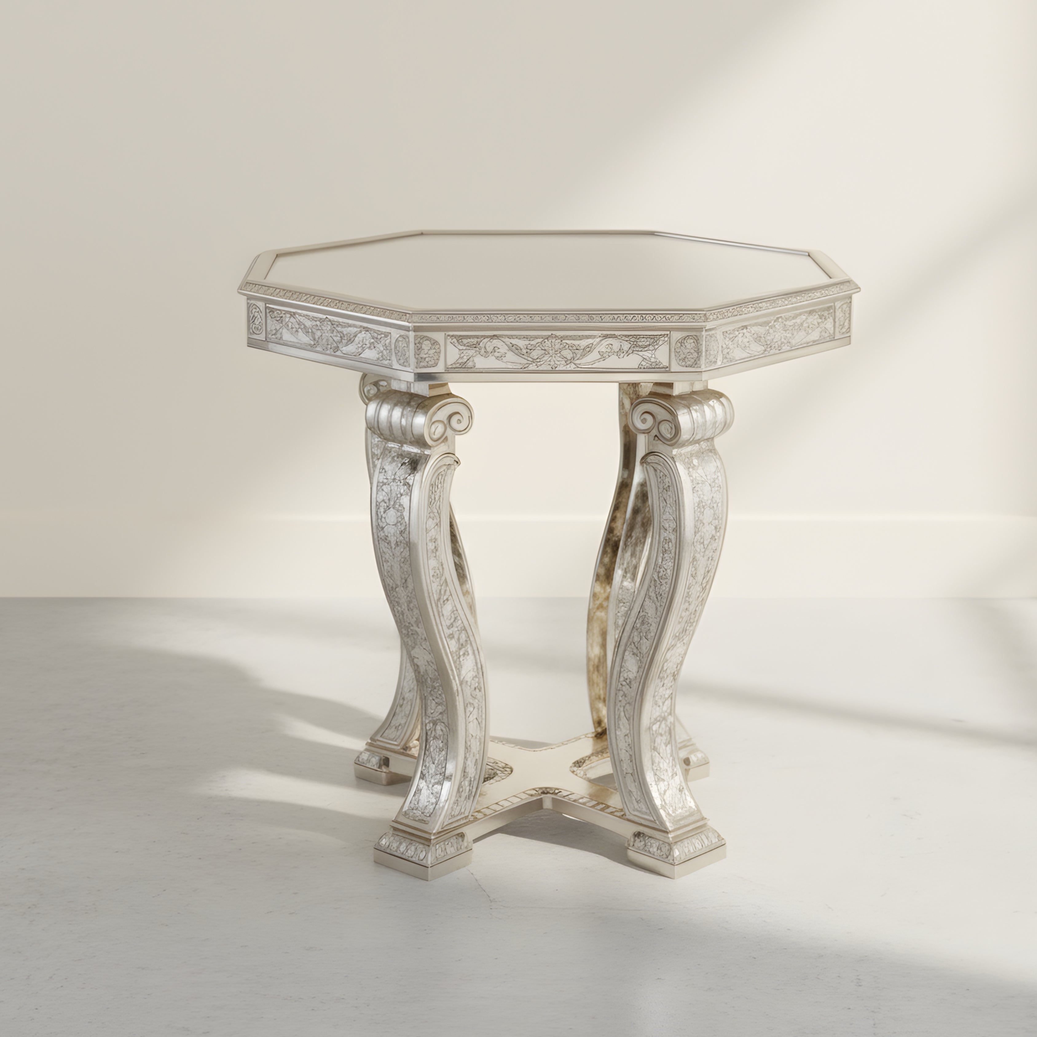 Introduce a piece of unparalleled artistry and material opulence with The Silver Clad Viceroy's Accent Table. This distinctive side table, perfectly sized to complement a sofa or armchair, is a celebration of intricate design, transforming a functional item into a highly collectible work of silver-plated art.