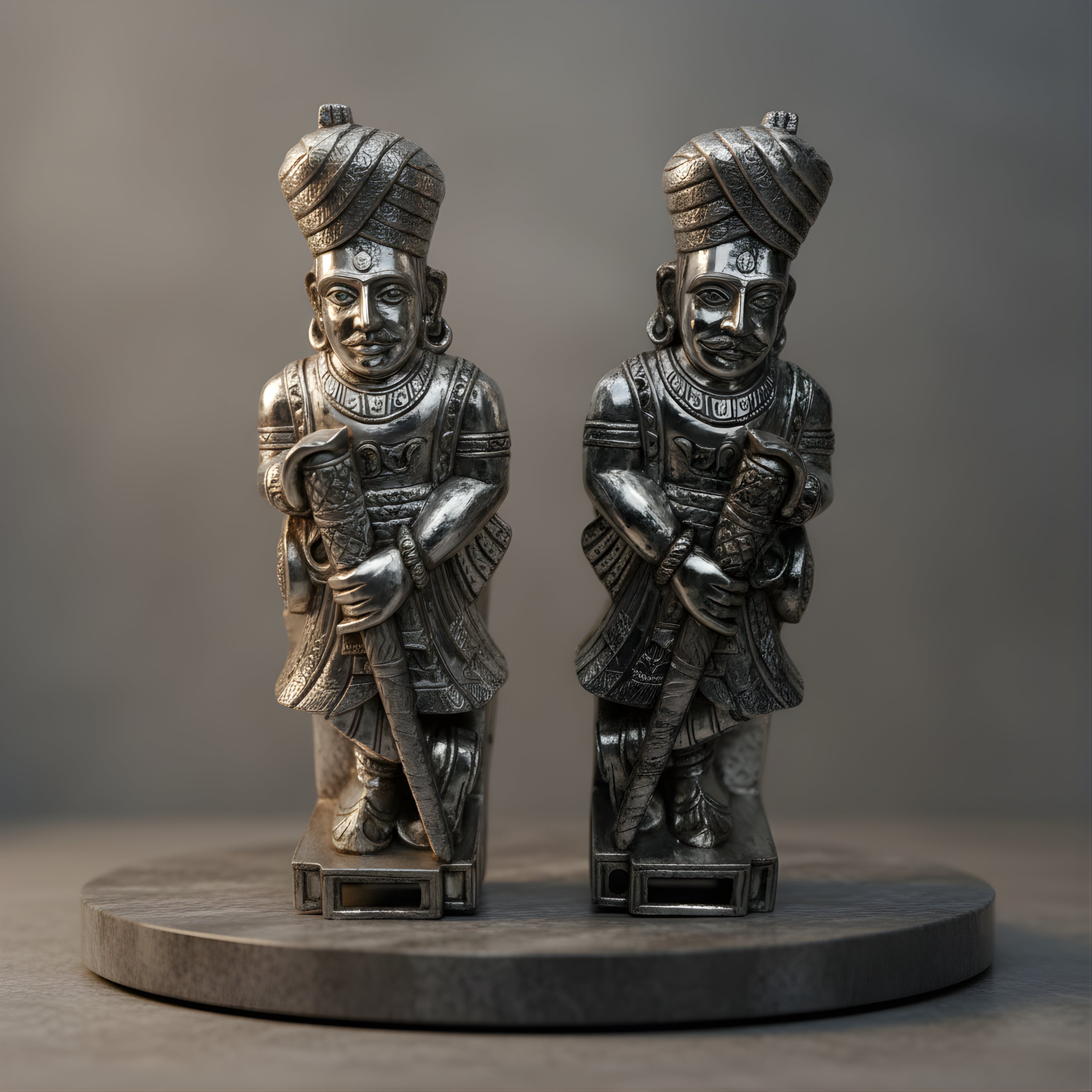 Establish an immediate sense of prestige and security with The Sterling Sentinels, a magnificent pair of hand-carved silver-plated statues. Inspired by the tradition of royal 'Pehredar' sentries, these pieces serve as sophisticated, symbolic guardians, designed to anchor a grand entryway, library, or formal living space in a luxury US estate.